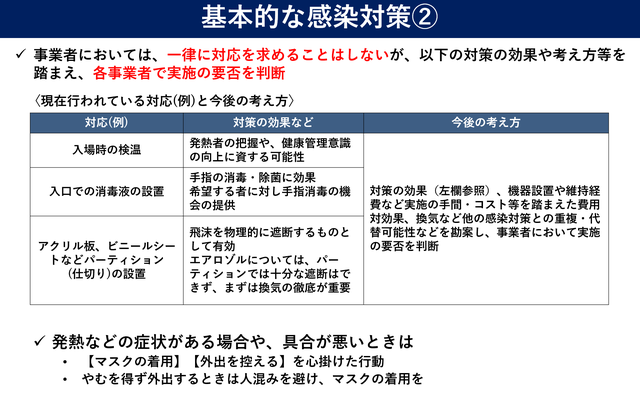 ただし、場面によっては、基本的感染対策が有効となることもありますので、引き続き場面や状況に応じた対応をお願いします。