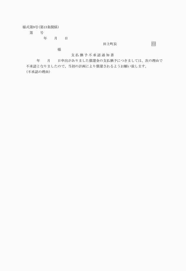 3 町長は、支払猶予を認めない旨の決定をしたときは、支払猶予不承認通知書(様式第9号)を当該借受人に交付するものとする。