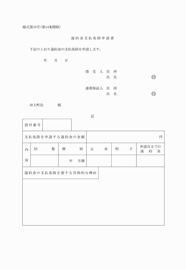 第14条 借受人は、違約金の支払免除を申請しようとするときは、その理由を記載した違約金支払免除申請書(様式第10号)を町長に提出しなければならない。