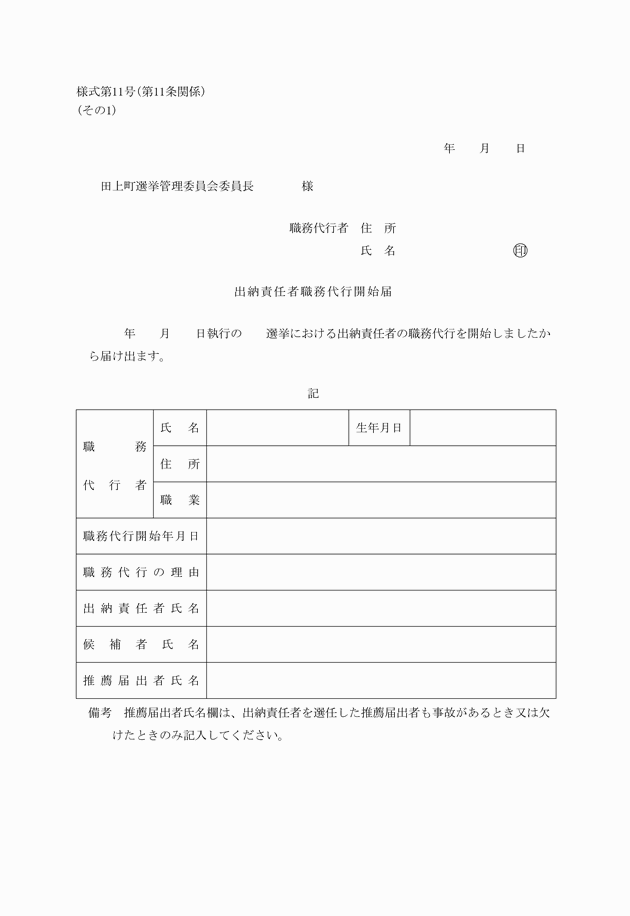2 法第183条(出納責任者の職務代行)第2項の規定により出納責任者に代ってその職務を行う者が提出すべき出納責任者の職務代行を開始した旨又はこれを終了した旨の届出の文書は、様式第11号に準じて作成しなければならない。