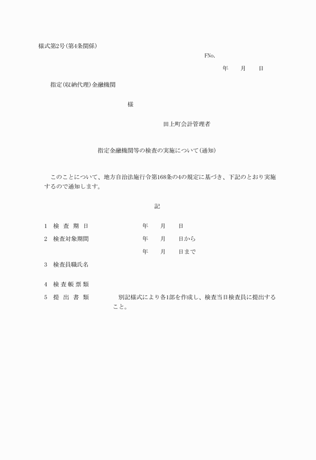 第1条 この要綱は、田上町財務規則(昭和58年田上町規則第11号。以下「財務規則」という。)第192条の規定に基づき実施する指定金融機関及び収納代理金融機関(以下「指定金融機関等」という。)の検査につき、財務規則に定めるもののほか、必要な事項を定めることを目的とする。