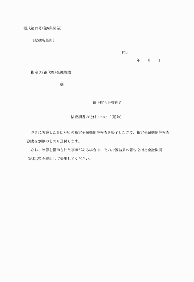第8条 検査員は、検査終了後速やかに総括店を経由して、受検金融機関に対し様式第13号の送付書を添付して指定金融機関等検査調書を送付しなければならない。