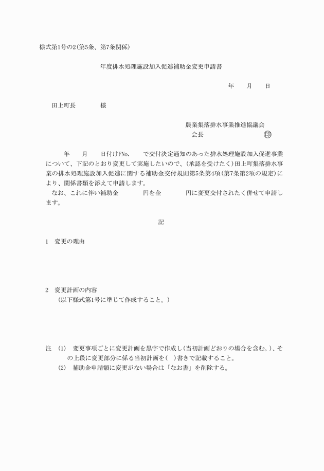 4 補助金に変更がある場合は、排水処理施設加入促進補助金変更交付申請書(様式第1号の2)を提出しなければならない。