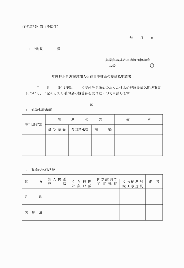 2 集排協議会は、補助金の概算払を受けようとするときは、排水処理施設加入促進事業補助金概算払申請書(様式第5号)を町長に提出しなければならない。