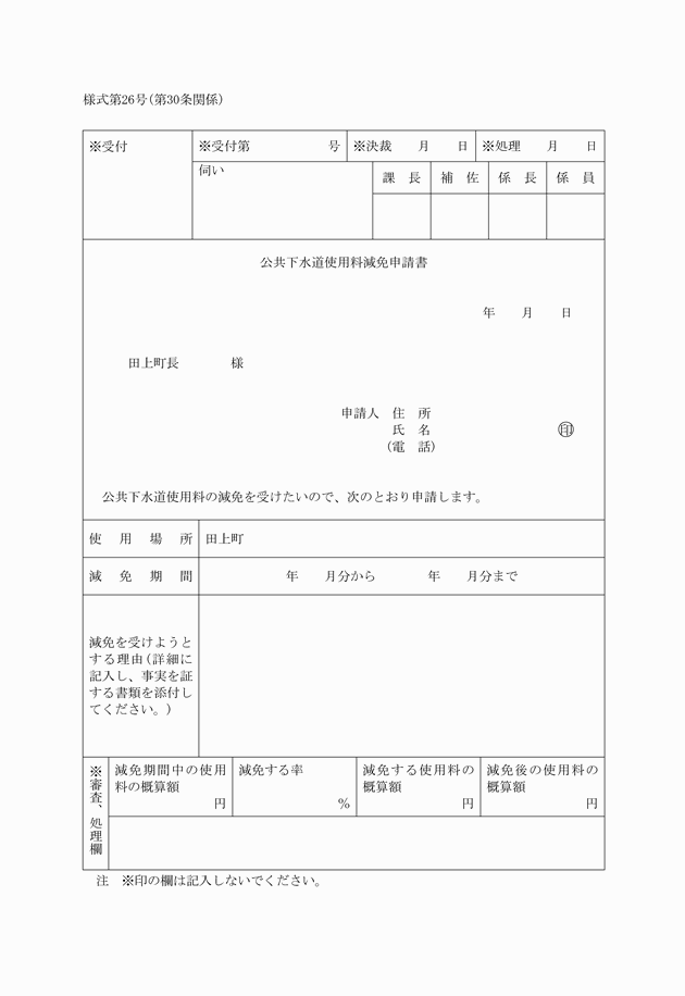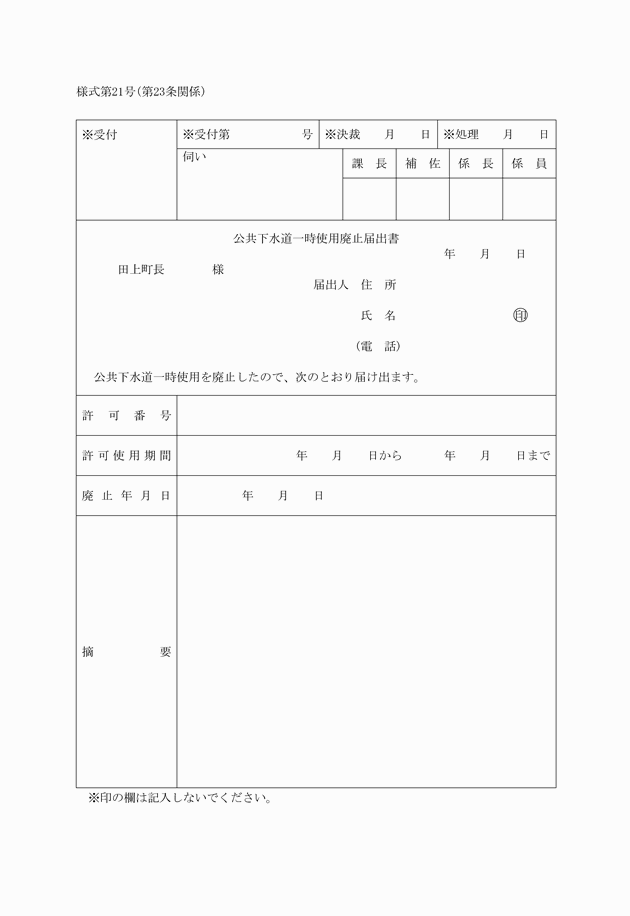 5 新たに処理区域になった際、既に除害施設を設置している者(法第12条の3第3項の規定による特定施設の使用の届出をした場合を除く。)は、処理区域に定められた日から30日以内に様式第13号による届出書により町長に届け出なければならない。