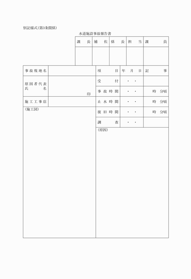 第3条 事故発生の当事者は、水道施設事故報告書(別記様式)により、直ちに水道係へ事故の状況を通報しなければならない。