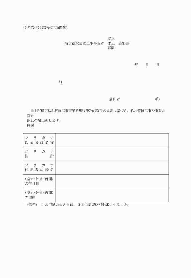 第4条 給水条例第7条第1項の指定は、給水装置工事の事業を行う者の申請により行う。