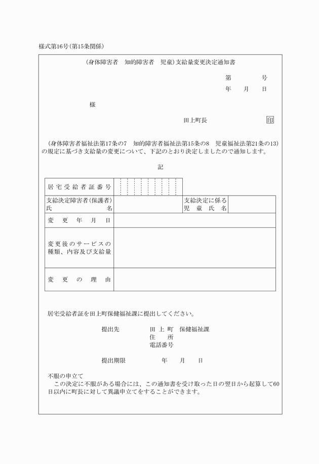 第15条 施行規則第21条の11第1項に規定する支給量の変更の決定に係る通知は、支給量変更決定通知書(様式第16号)によるものとする。