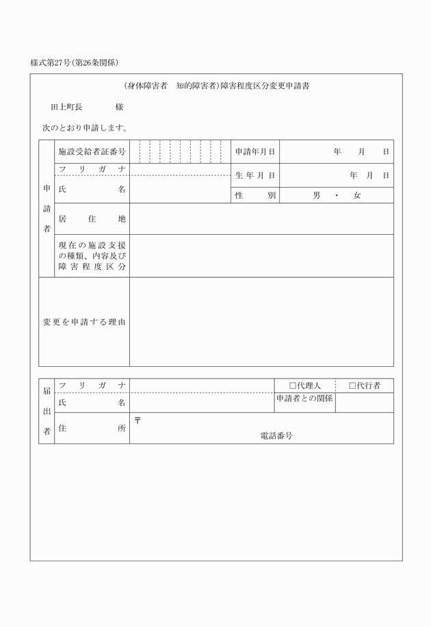第26条 施行規則第9条の23に規定する障害程度区分の変更の申請は、障害程度区分変更申請書(様式第27号)によるものとする。