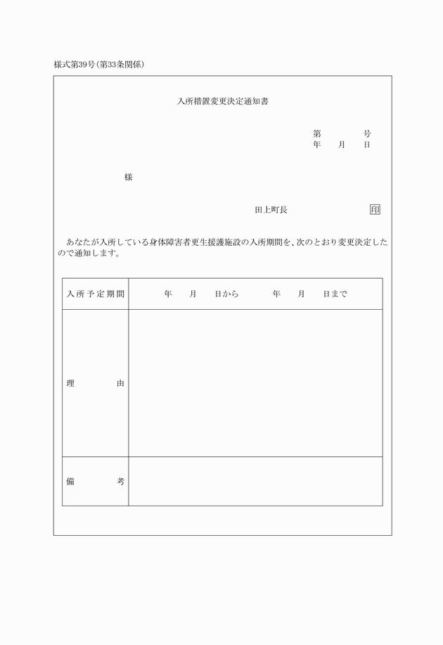 3 町長は、法第18条第3項に規定する措置を行った身体障害者(以下「被措置者」という。)について、当該措置を変更することを決定したときは、入所措置変更決定通知書(様式第39号)を当該身体障害者に送付しなければならない。