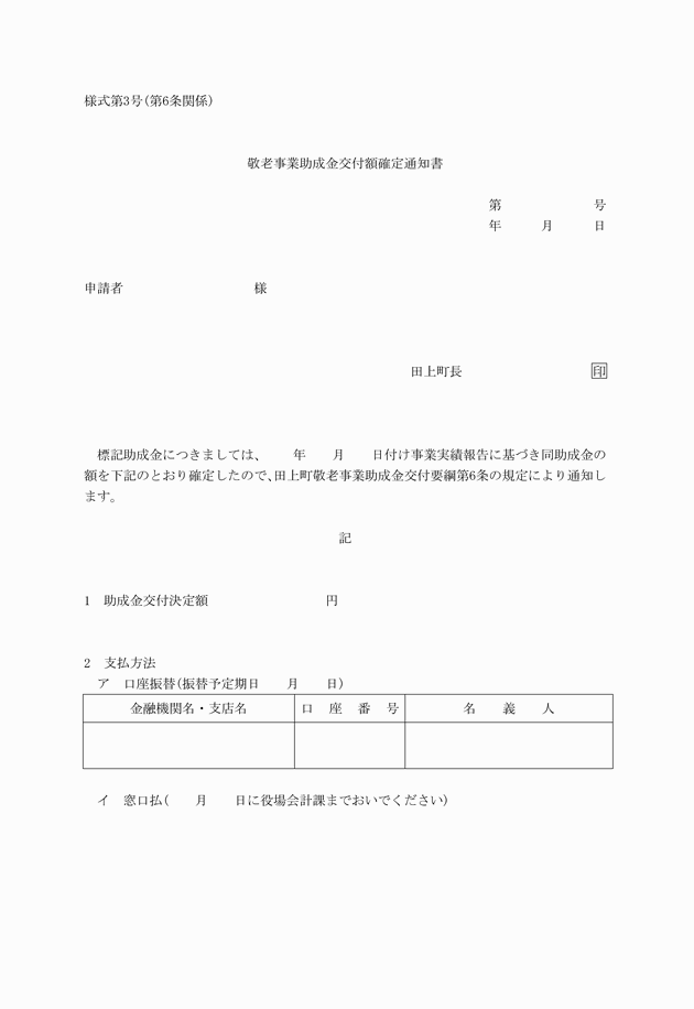 第6条 町長は、実績報告書を受理したときは、その内容を審査し、適正と認めたときは、交付すべき助成金の額を確定して敬老事業助成金交付額確定通知書(様式第3号)により申請者に通知するとともに、実績報告書受理後30日以内に助成金を支払うものとする。