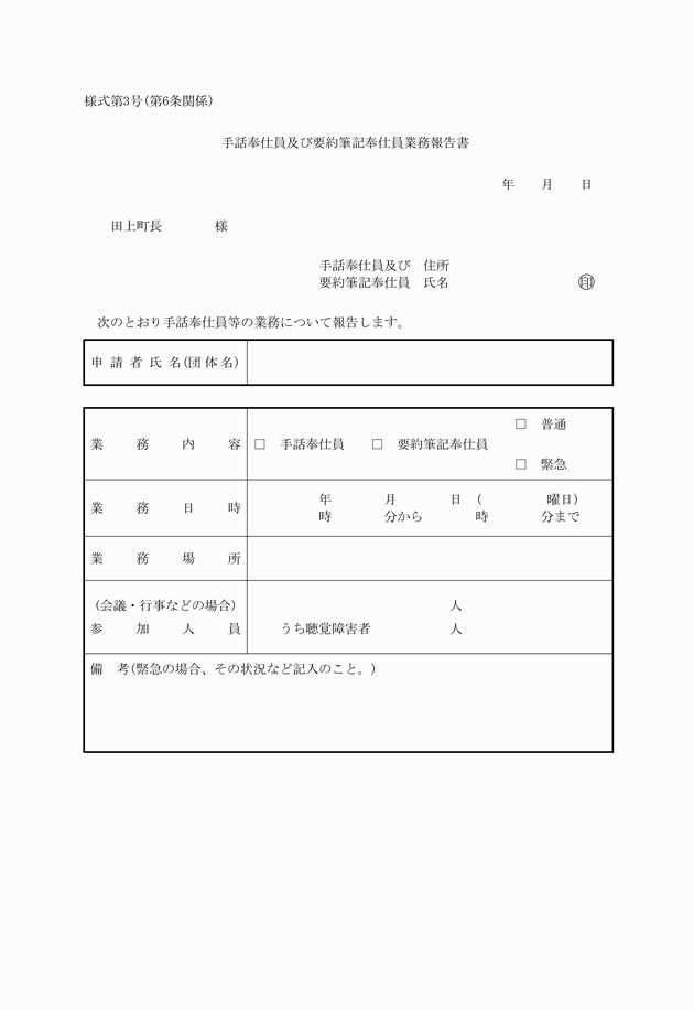 第4条 手話奉仕員等の派遣を希望する者は、手話奉仕員及び要約筆記奉仕員派遣申請書(様式第1号)を派遣を希望する日の2週間前までに、町長に提出するものとする。ただし、緊急やむを得ない場合には、この限りではない。