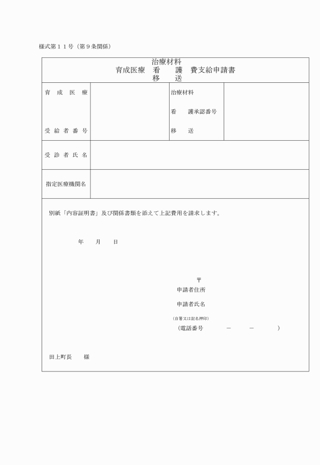 (4) 治療材料、看護料及び移送費の承認申請は、育成医療治療材料・看護・移送承認申請書(様式第9号)により町長に申請するものとする。