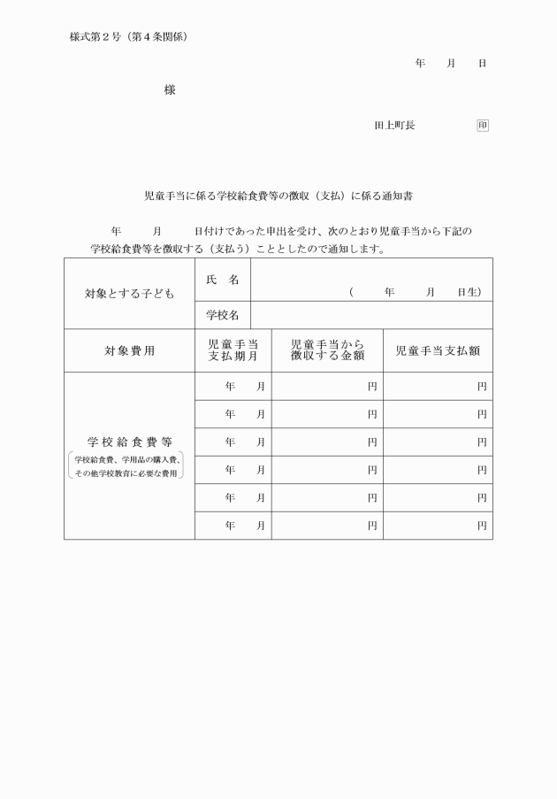 第3条 学校給食費等の支払に充てる旨の申出は、当該支払に充てる最初の児童手当の支払期月の前月10日までに児童手当に係る学校給食費等の徴収に関する申出書(様式第1号)を町長に提出することにより行わなければならない。