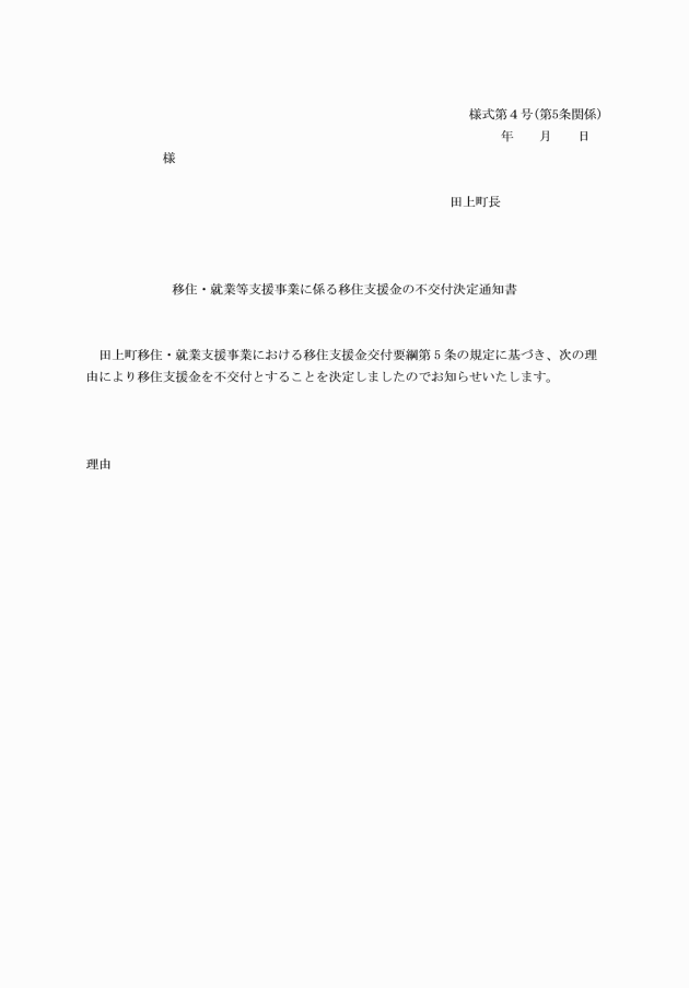 審査の結果支援金の交付を不適当と認める場合又は予算上の理由等により当該年度における支援金の交付が不可である場合は、不交付決定通知書(様式第4号)により申請者に通知する。
