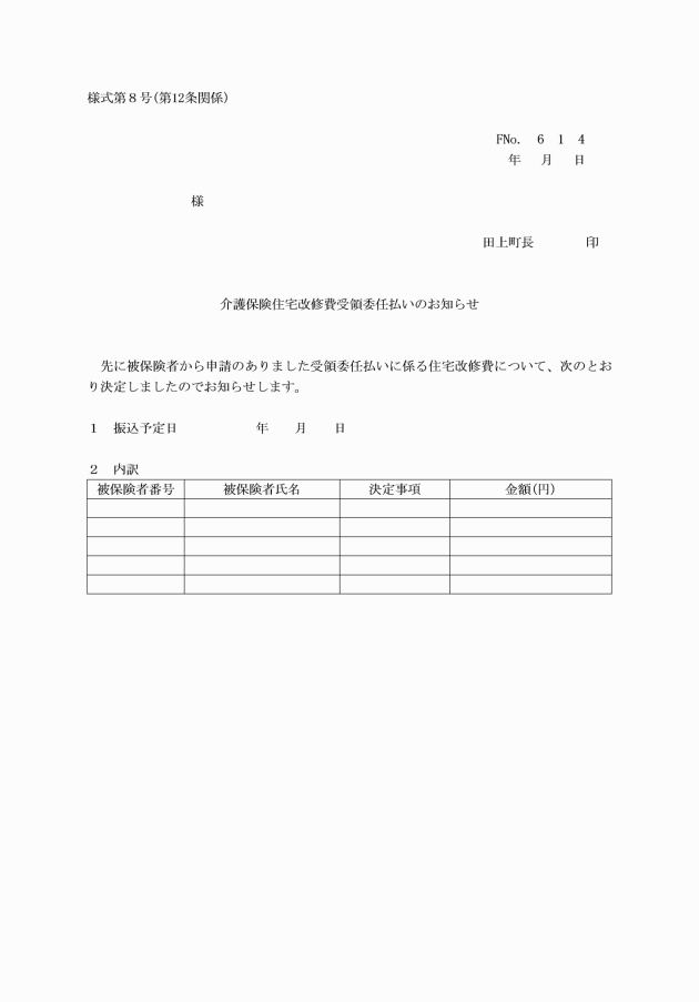 第12条 町長は受領委任払い制度に係る住宅改修費の支給申請があったときは、当該住宅改修費に係る支給又は不支給の決定を行い、介護保険住宅改修費受領委任払いのお知らせ(様式第8号)を当該受領委任払い取扱事業者に送付する。