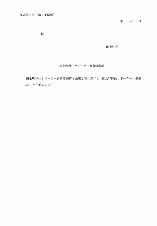 第5条 サポーターの認定を希望する者は、町長に田上町移住サポーター登録申請書(様式第1号)を提出しなければならない。